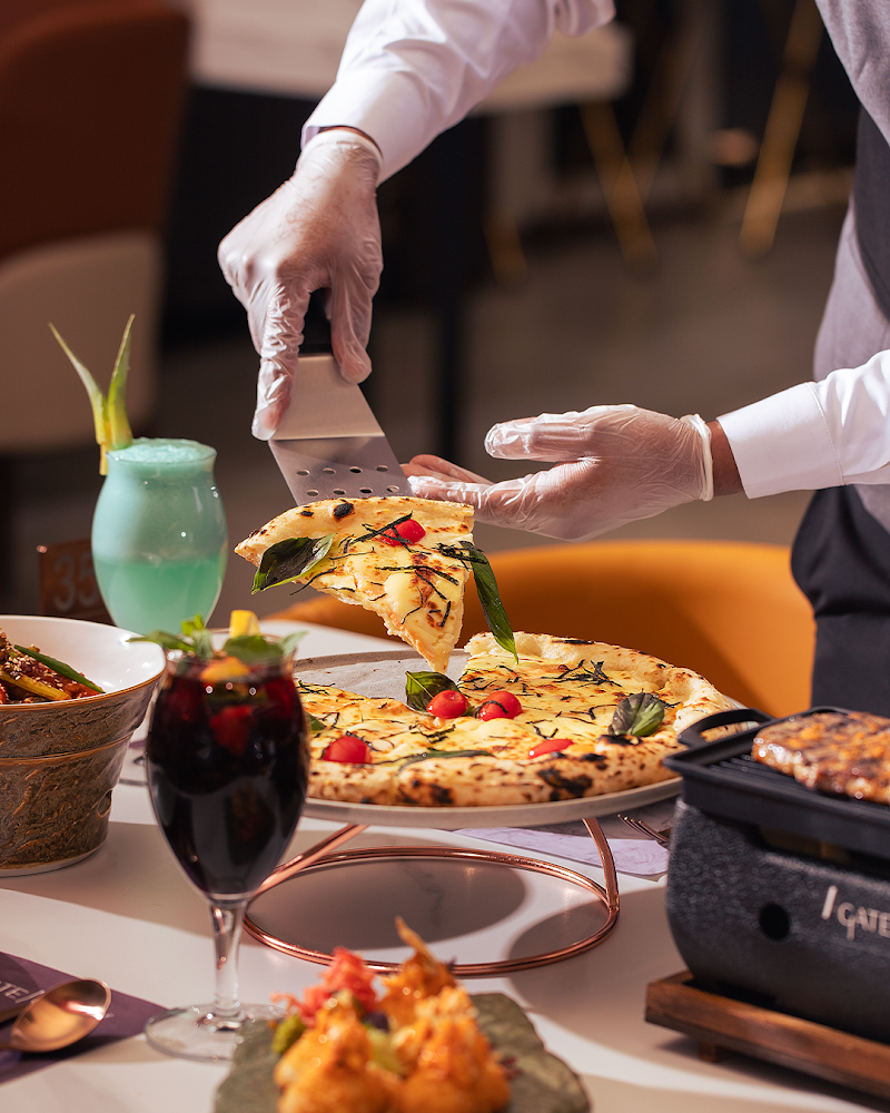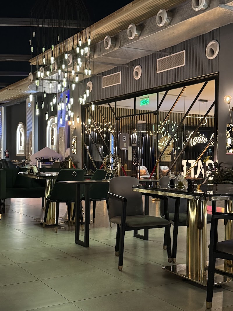 مقبلات وأطباق عالمية تُقدم في مكان معاصر يضمّ نوافذ ممتدة من الأرض حتى السقف
