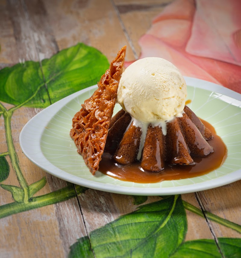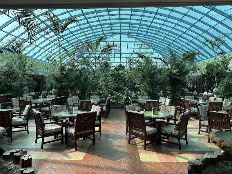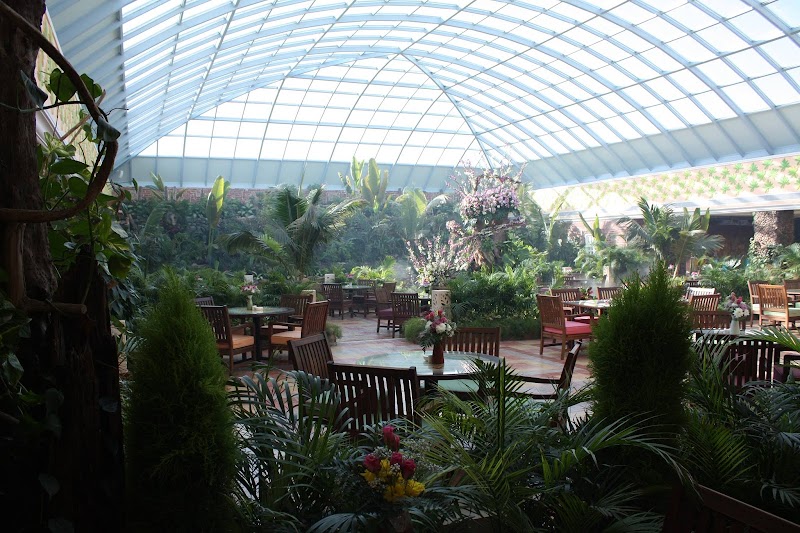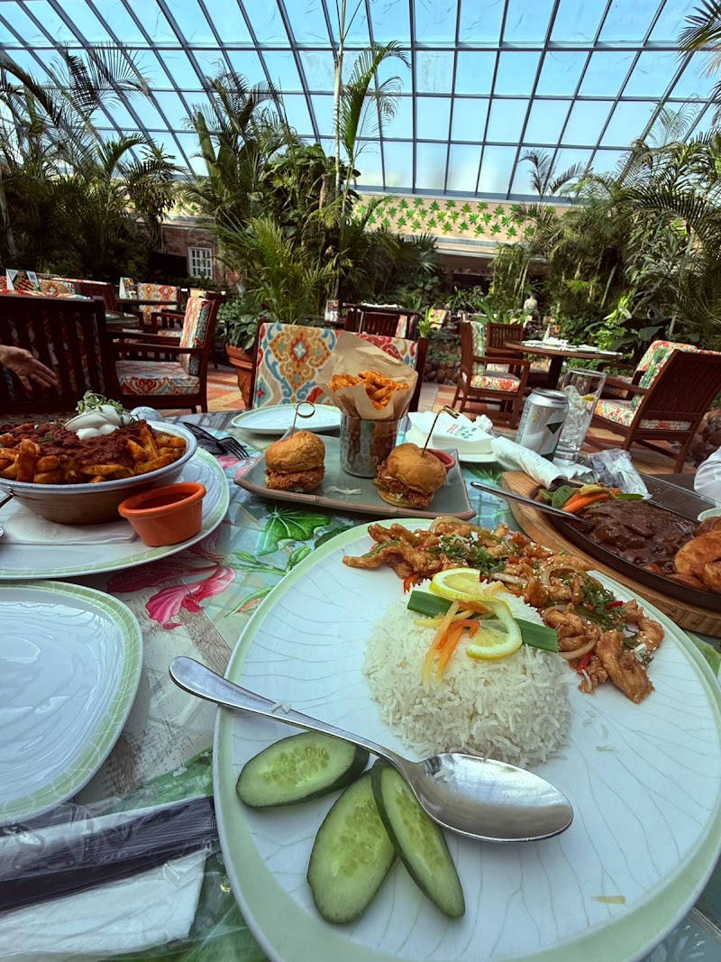 مقهى هادئ يقدّم أطباقًا عالمية في ردهة واسعة تصطف على جانبَيها نباتات وأشجار