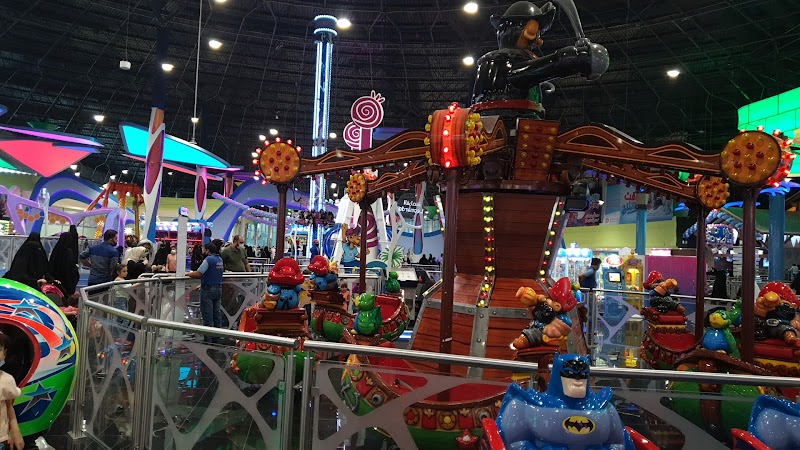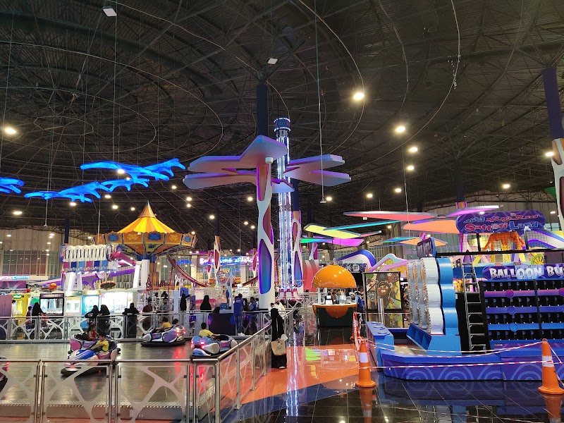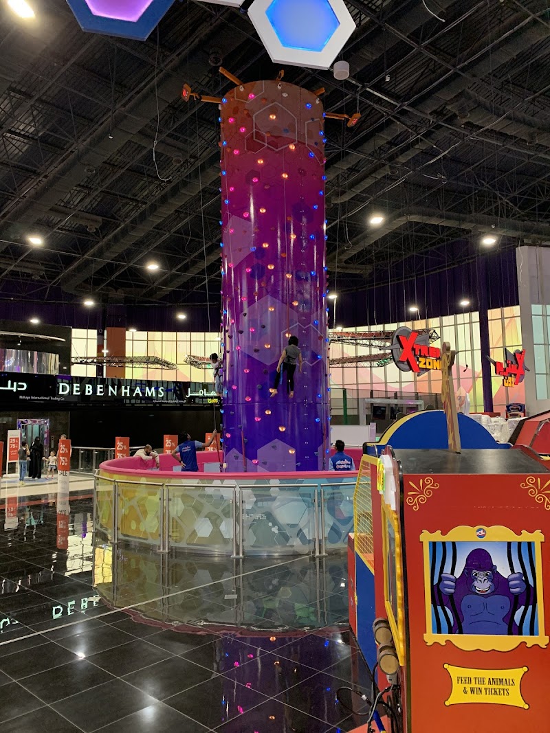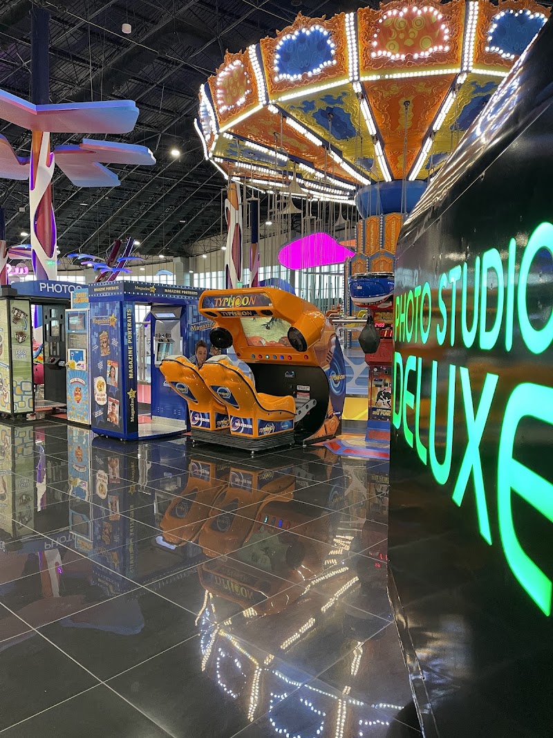 Shopping center theme park with bumper cars, thrill rides & arcade games, plus a climbing wall.